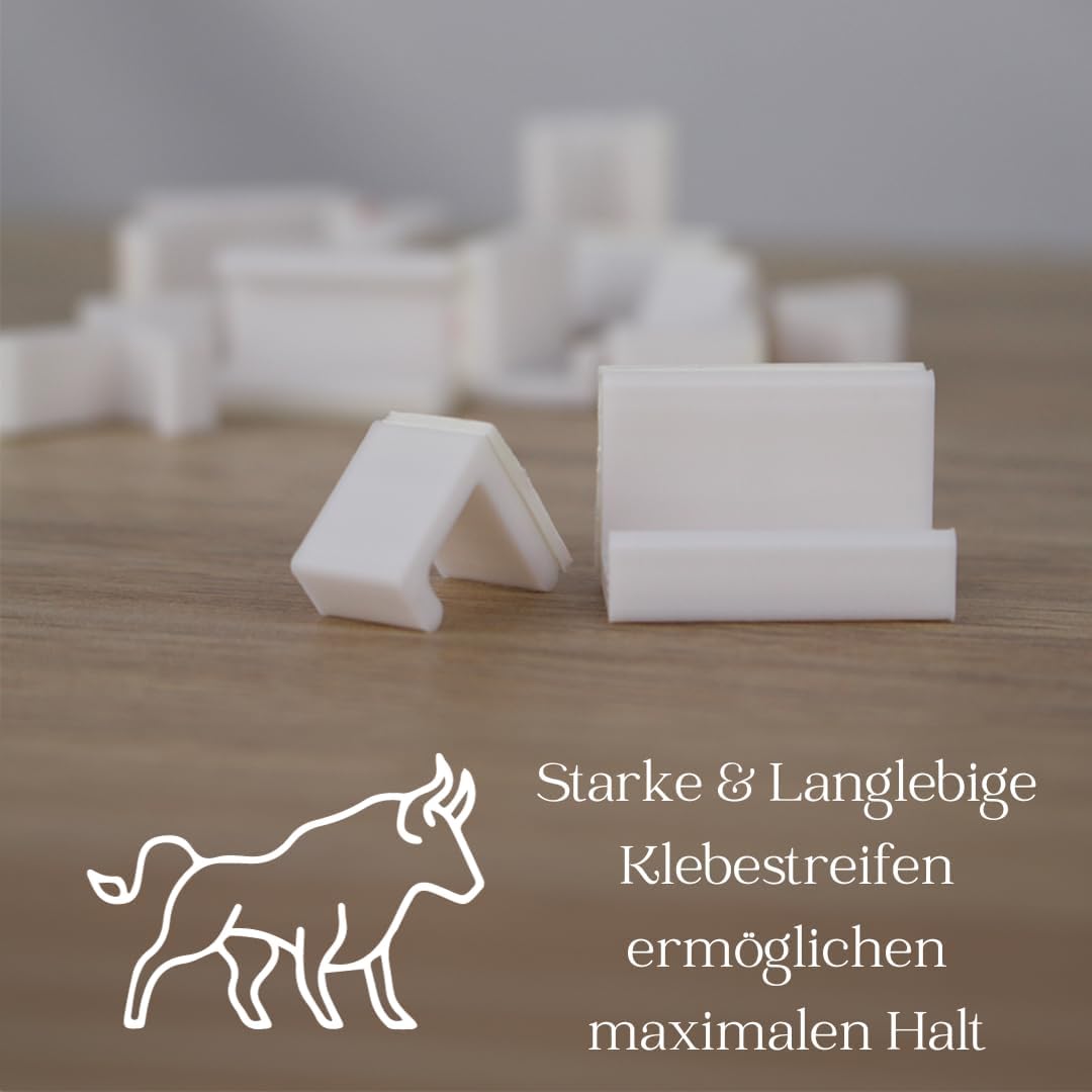 🛠️ Montage ohne Bohren: Die Clips sind mit Klebestreifen vorbereitet, die Anbringung erfolgt schnell und ohne Werkzeug.