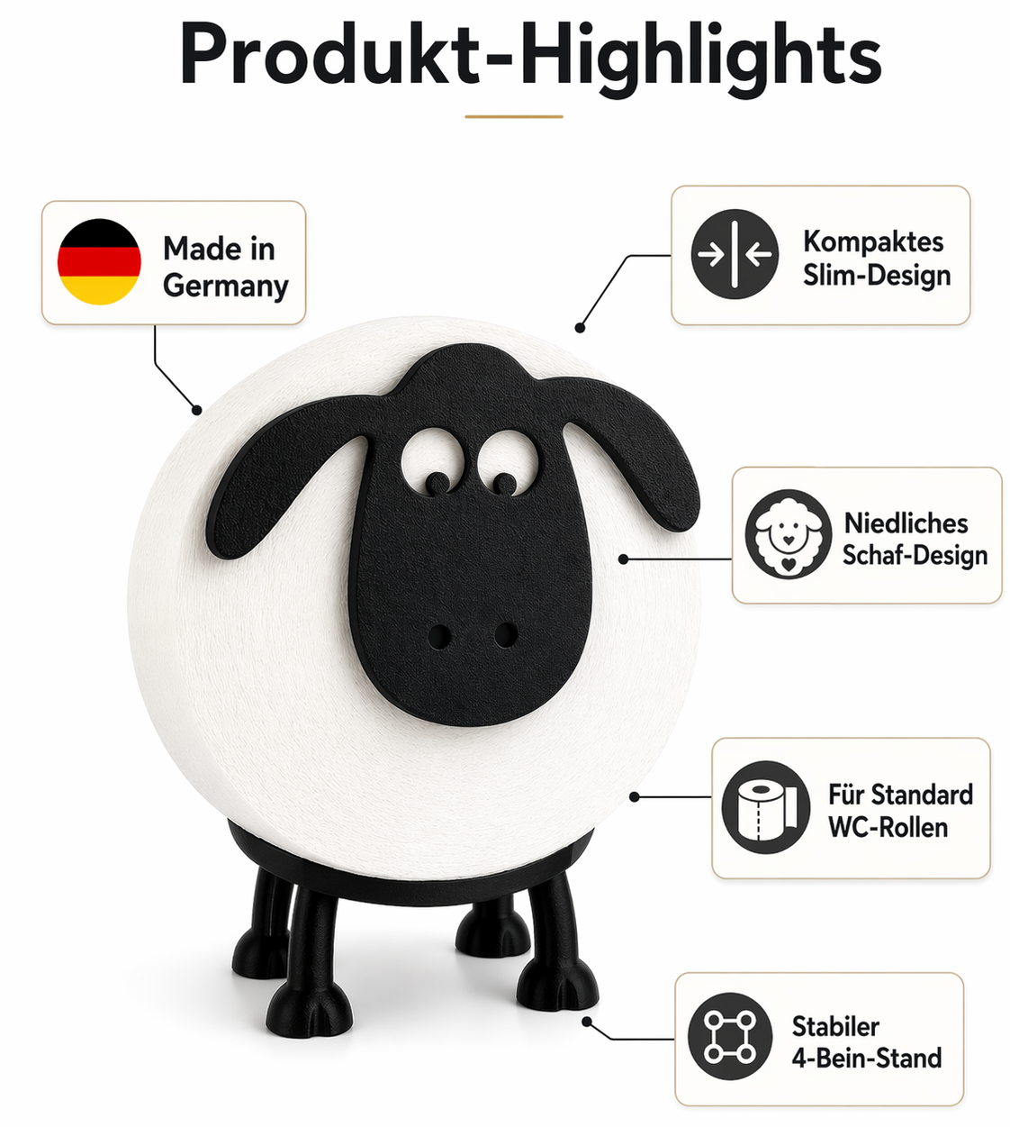 Das Dori Toilettenpapierhalter Schaf 3er Set stapelbar verbindet praktische Funktionalität mit verspieltem Design und einer besonderen Stapel-Überraschung. Dank der cleveren Beinkonstruktion, zwei Schafe mit geraden Beinen als solide Basis und ein drittes Schaf mit gespreizten Beinen als krönender Abschluss, lassen sich die drei Doris zu einer charmanten kleinen Schaf-Pyramide aufbauen. Die Toilettenpapierrollen bilden dabei die weichen, flauschigen Schafkörper, während die markanten schwarzen Schafköpfe mit den typischen Schlappohren und den süßen Schnauzen aus hochwertigem 3D-Druck für den unverkennbaren Schaf-Look sorgen. Die gespreizten Beine des oberen Schafs umschließen dabei sicher die beiden unteren Rollen und sorgen für einen stabilen, rutschfesten Aufbau. Alternativ lassen sich die drei Schafe natürlich auch einzeln nebeneinander aufstellen, sodass das Set flexibel an verschiedene Platzverhältnisse anpassbar ist. Alle Halter sind speziell für handelsübliche Toilettenpapierrollen mit Innendurchmesser von 42mm und 44mm konzipiert und passen somit zu nahezu allen gängigen Markenrollen. Besonders für Tierliebhaber und alle, die ihr Badezimmer mit einem außergewöhnlichen Accessoire aufwerten möchten, ist das Schaf-Toilettenpapierhalter-Set ein stilvolles Highlight und eignet sich zudem hervorragend als originelle Geschenkidee zum Einzug, Geburtstag oder Weihnachten. Im Lieferumfang enthalten sind 3x Dori Toilettenpapierhalter Schaf (2x mit geraden Beinen, 1x mit gespreizten Beinen zum Stapeln), jeweils bestehend aus Schafkopf und Beinkonstruktion. Toilettenpapierrollen und weitere abgebildete Gegenstände sind nicht im Lieferumfang enthalten.