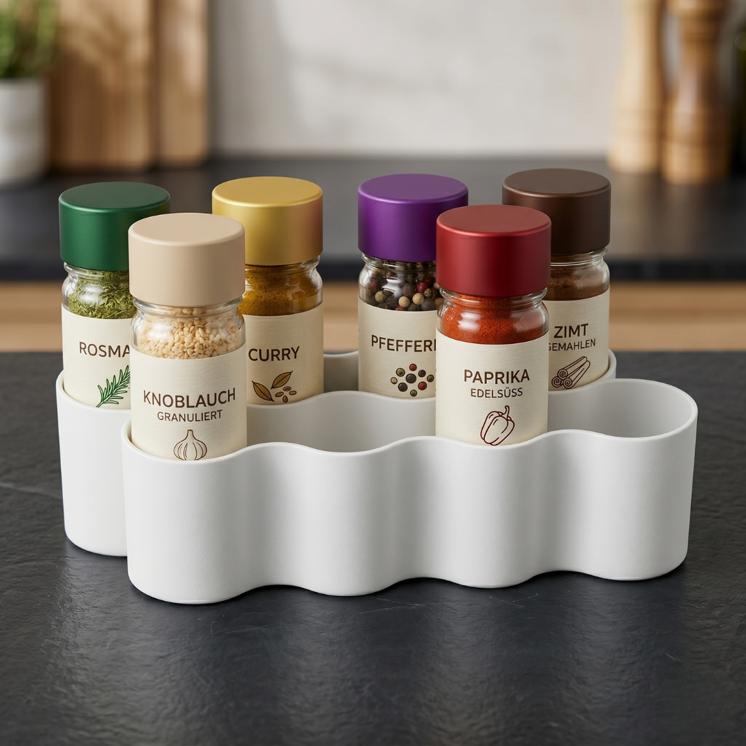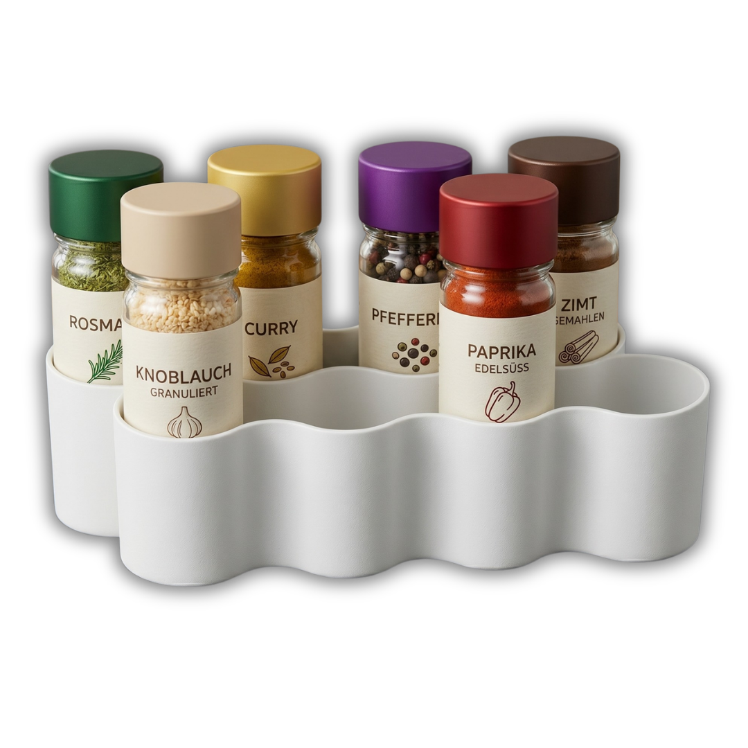 Der Gewürz-Organizer bietet Platz für bis zu 8 Standard-Gewürzgläser mit einem Durchmesser von 4,2 cm – perfekt passend für gängige Marken wie Aldi oder Lidl. Gedruckt aus umweltfreundlichem PLA, überzeugt der Halter durch Stabilität, Langlebigkeit und ein modernes, platzsparendes Design. Die in dieser Beschreibung genannten Markennamen dienen ausschließlich zur Verdeutlichung der Kompatibilität mit den jeweiligen Produkten. Alle genannten Marken und Markenzeichen sind Eigentum ihrer jeweiligen Inhaber. Es besteht keine geschäftliche Verbindung zwischen uns und den genannten Markeninhabern. Gewürze nicht im Lieferumfang enthalten. Lieferumfang: 1x Gewürz-Organizer (weiß) für 8 Gläser.
