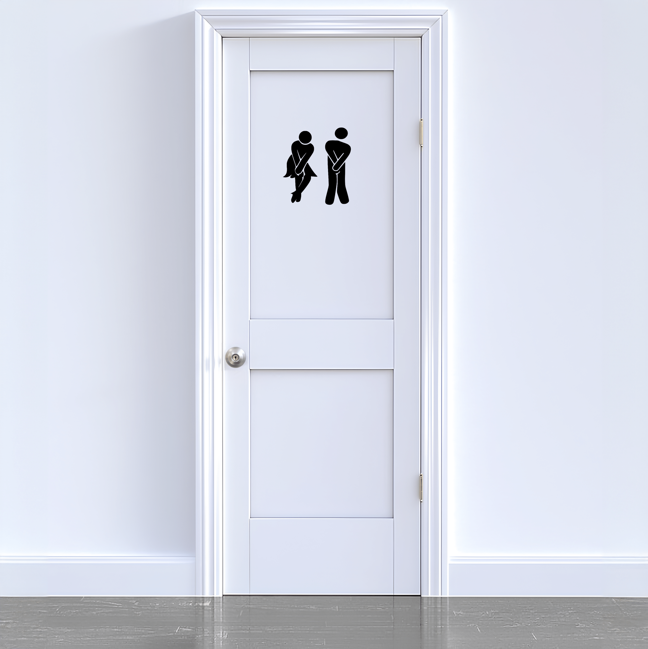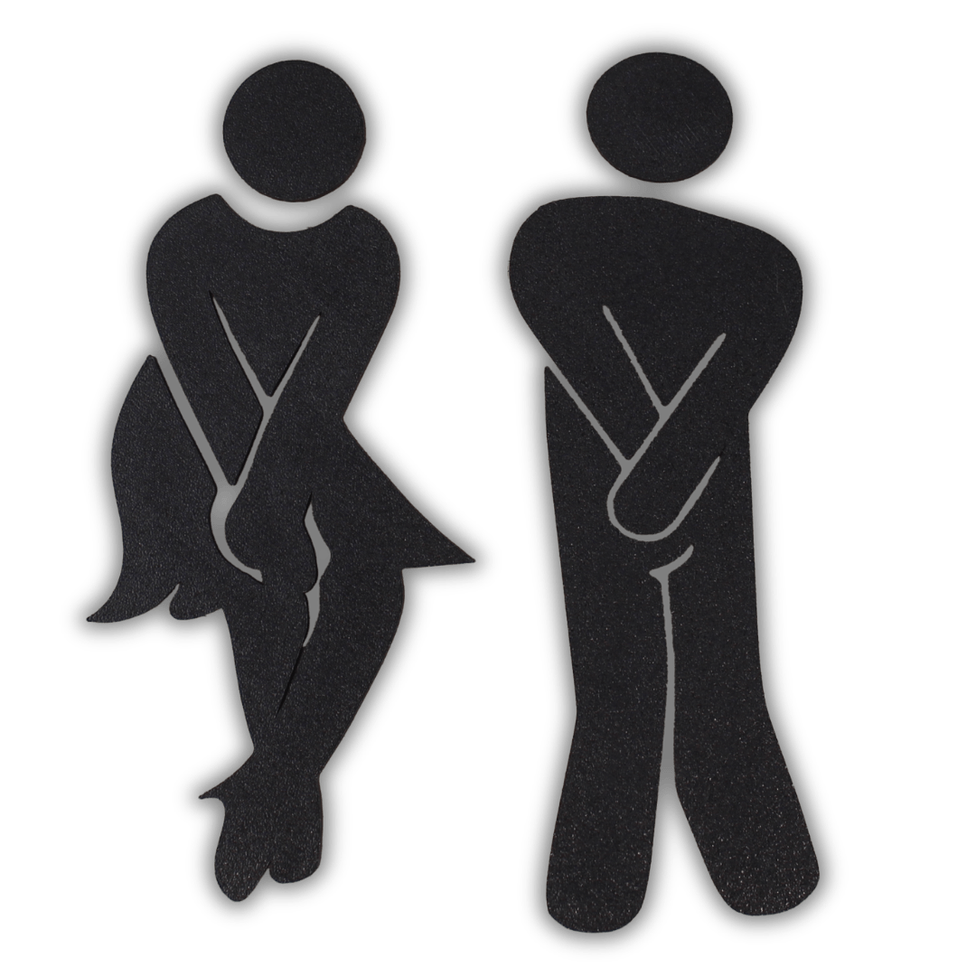 🚻 Humorvolles Mann/Frau-Design: Das Set zeigt zwei Strichfiguren in der unverkennbaren „Ich muss dringend“ Pose, ein universell verständliches Motiv mit garantiertem Schmunzel-Effekt bei jedem Gast.