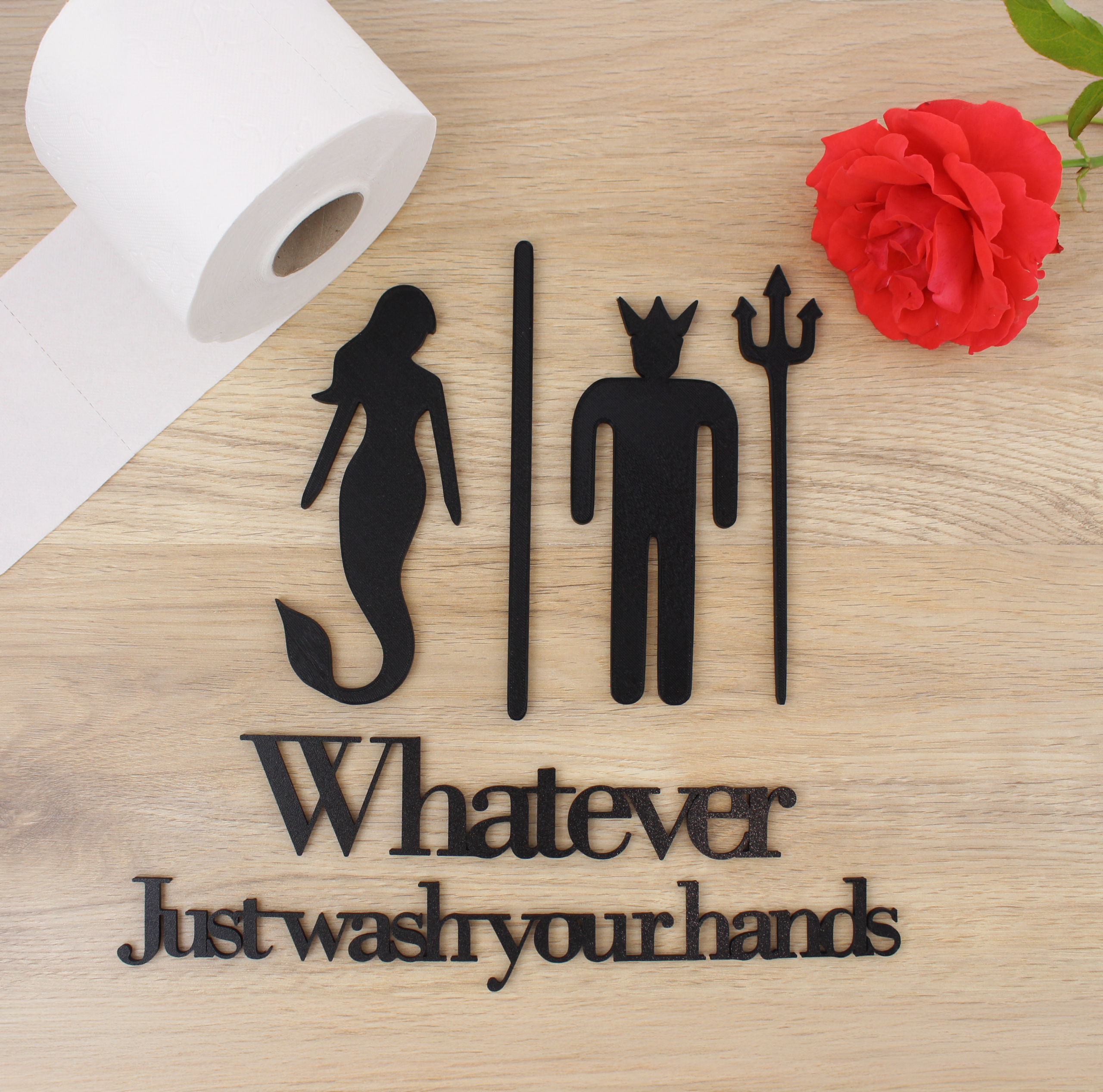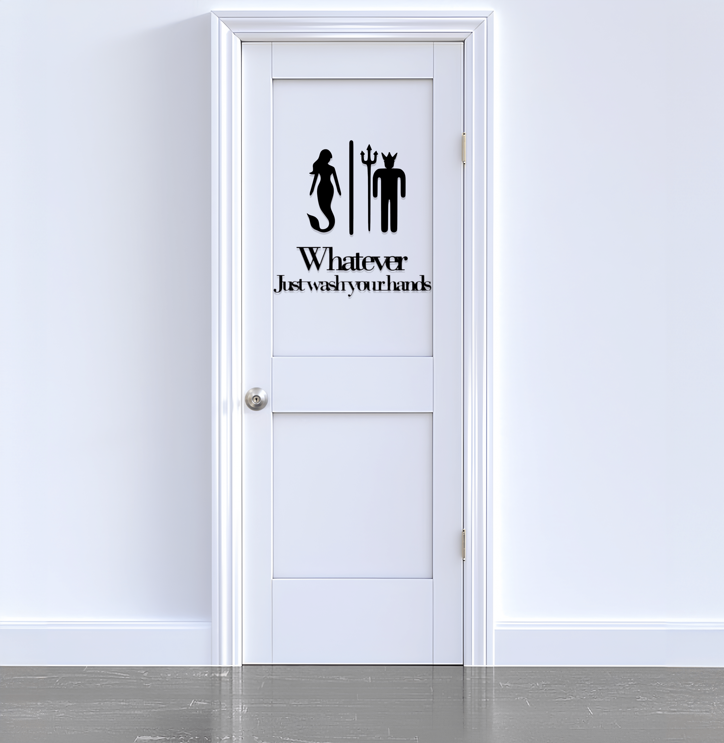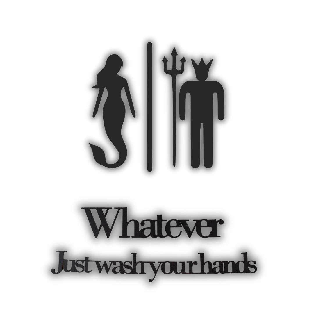 🧜♀️ Maritimes 2-teiliges Design: Das Set besteht aus einer eleganten Meerjungfrau und dem Meeresgott Neptun mit Dreizack sowie dem Schriftzug „Whatever, Just wash your hands“, ein fantasievoller Hinweis mit Augenzwinkern für jede WC-Tür.