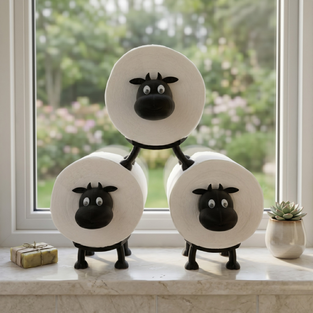 🐄 Humorvolles Kuhherde-Design: Drei niedliche Kühe mit schwarzen Köpfen, beweglichen Wackelaugen und markanten Hörnern verwandeln jede Toilettenpapierrolle in einen Blickfang.