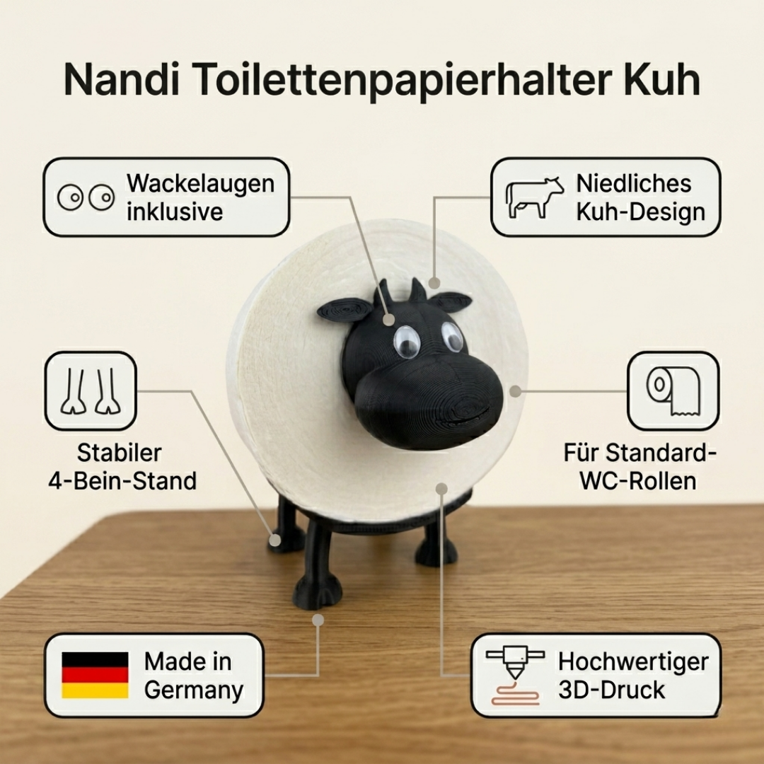 Das Nandi Toilettenpapierhalter Kuh 3er Set stapelbar in Schwarz ist eine besonders kreative und dekorative Lösung zur Aufbewahrung von Toilettenpapier im Badezimmer oder Gäste-WC. Durch die Kombination aus zwei Kühen mit geraden Beinen und einer dritten Kuh mit gespreizten Beinen lässt sich eine stabile Mini-Pyramide aufbauen, die mit ihrem humorvollen Kuh-Design garantiert jedem Gast ein Lächeln ins Gesicht zaubert. Die gespreizten Beine der oberen Kuh umschließen dabei sicher die beiden unteren Rollen und sorgen für einen rutschfesten Halt. Ob als stapelbare Pyramide, als nebeneinander aufgestellte Kuhherde oder als einzelne Nandis in verschiedenen Räumen, das Set bietet maximale Flexibilität und fügt sich harmonisch in verschiedene Badezimmer-Stile ein. Im Lieferumfang enthalten sind 3x Nandi Toilettenpapierhalter Kuh (2x gerade Beine, 1x gespreizte Beine) inklusive Kuhköpfe und Beinkonstruktionen. Toilettenpapierrollen und weitere abgebildete Gegenstände sind nicht im Lieferumfang enthalten.