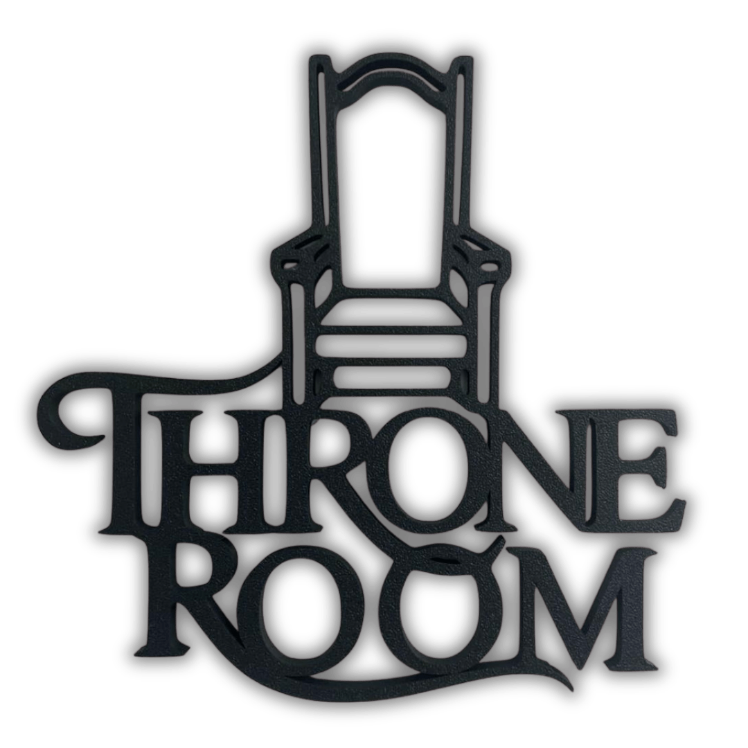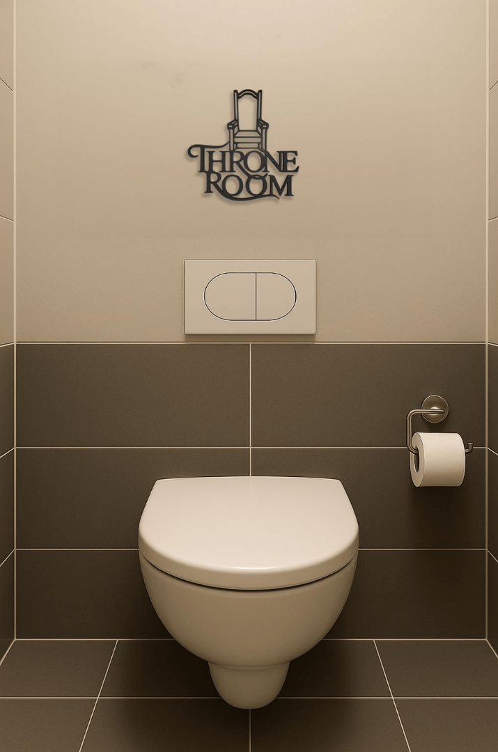 👑 Humorvoller britischer Wortwitz: Der charmante Schriftzug „Throne Room“ (Thronsaal) mit integrierter Thron-Silhouette bringt englischen Klo-Humor mit Stil an jede Toilettentür, ein garantierter Schmunzler für Gäste mit internationalem Flair.