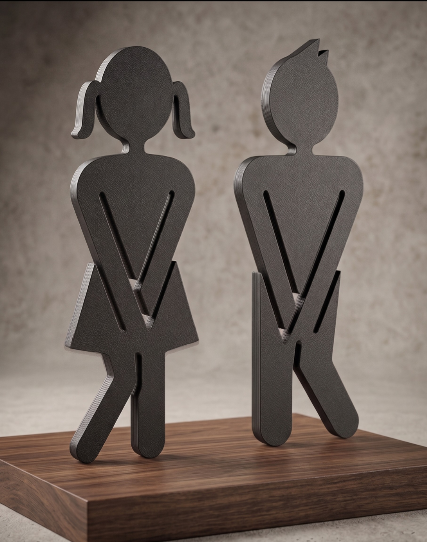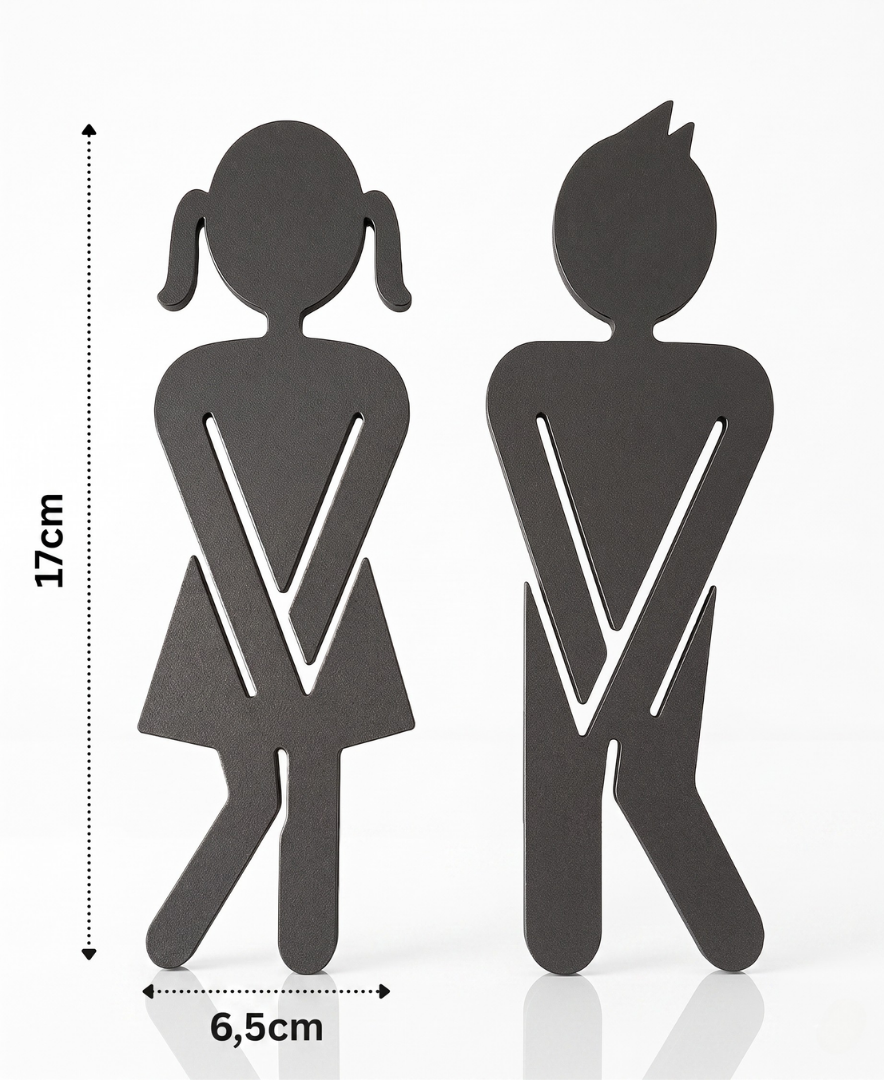 Dieses moderne WC Türschild-Set zeigt humorvoll die Piktogramme von Mann und Frau. Die Figuren bestehen aus schwarzem, leicht strukturiertem Kunststoff mit klarer Kontur und sind ideal für öffentliche oder private Sanitärräume. Die Anbringung erfolgt schnell und einfach per Klebepunkte, ganz ohne Bohren oder Werkzeug. Lieferumfang: 1x Figur Mann, 1x Figur Frau, 10x Klebepunkte zur Befestigung.