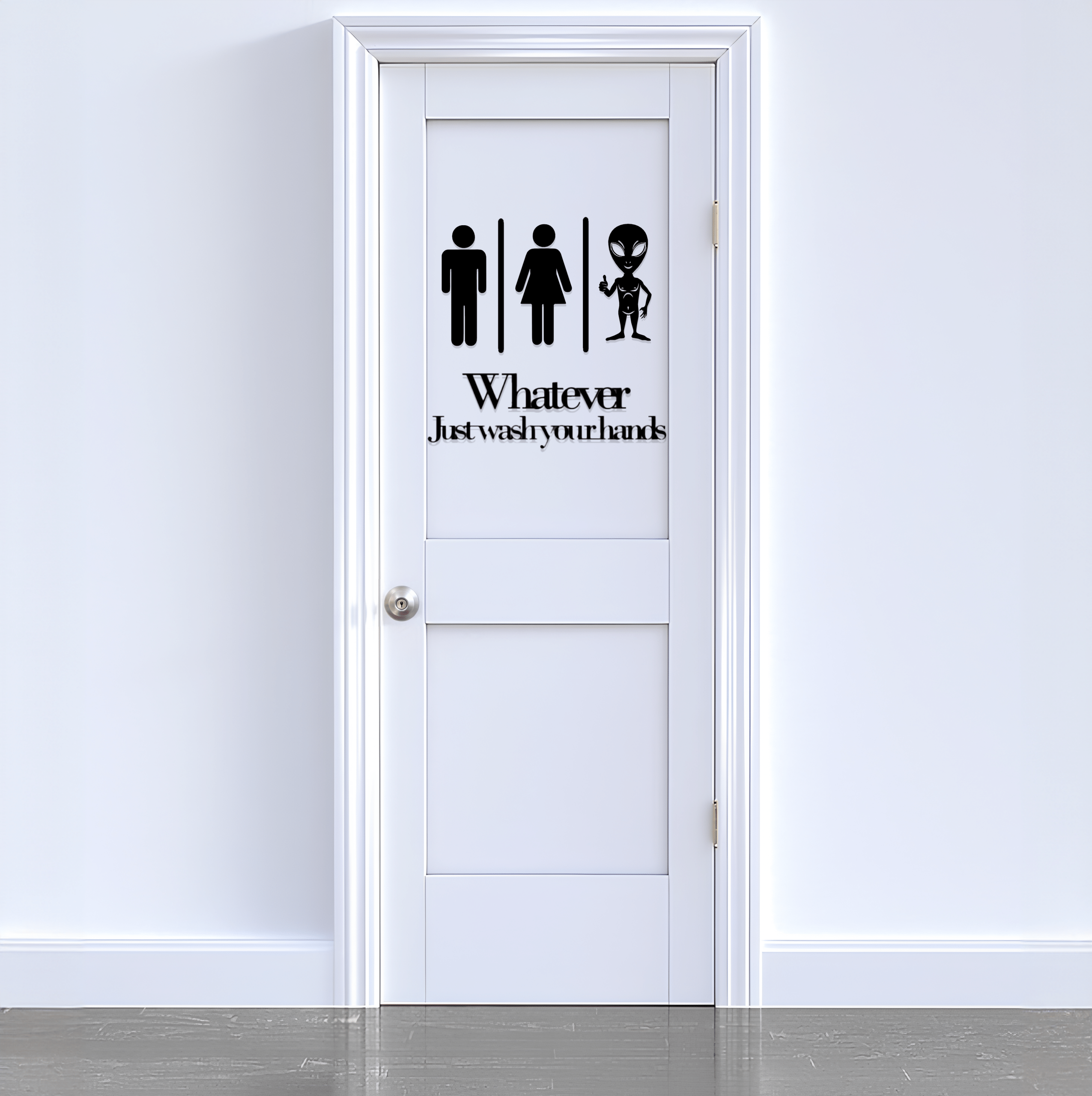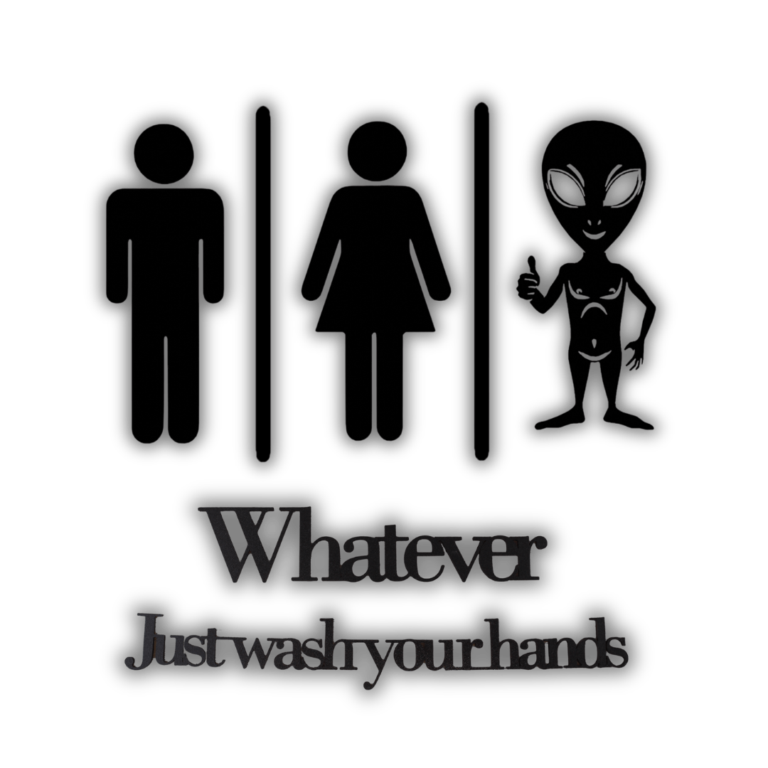 🚻 Humorvolles 2-teiliges Design: Das Set besteht aus drei stilisierten Figuren (Alien, Mann und Frau) und dem Schriftzug „Whatever, Just wash your hands“, ein sympathischer Hinweis mit Augenzwinkern für jede WC-Tür.